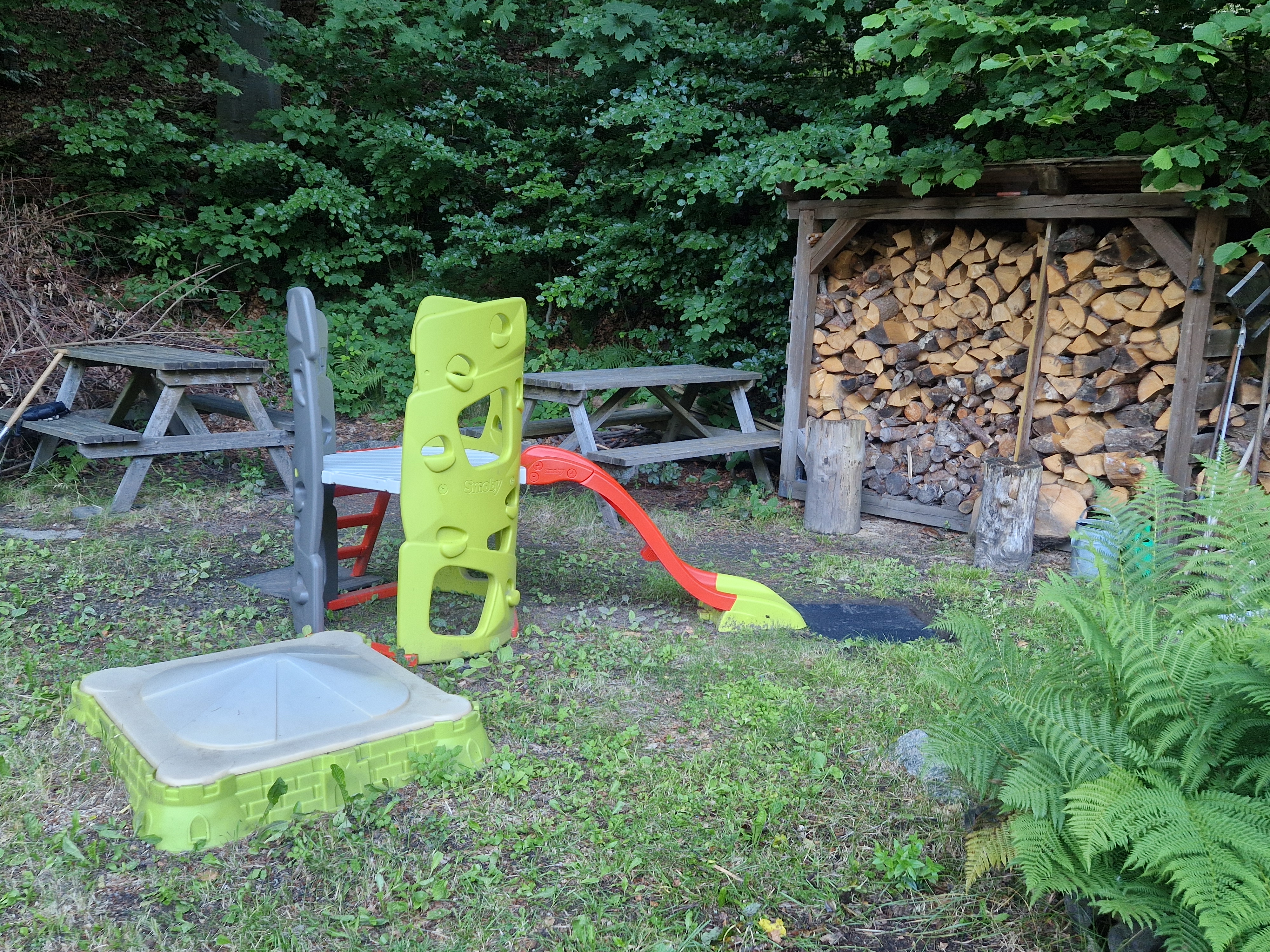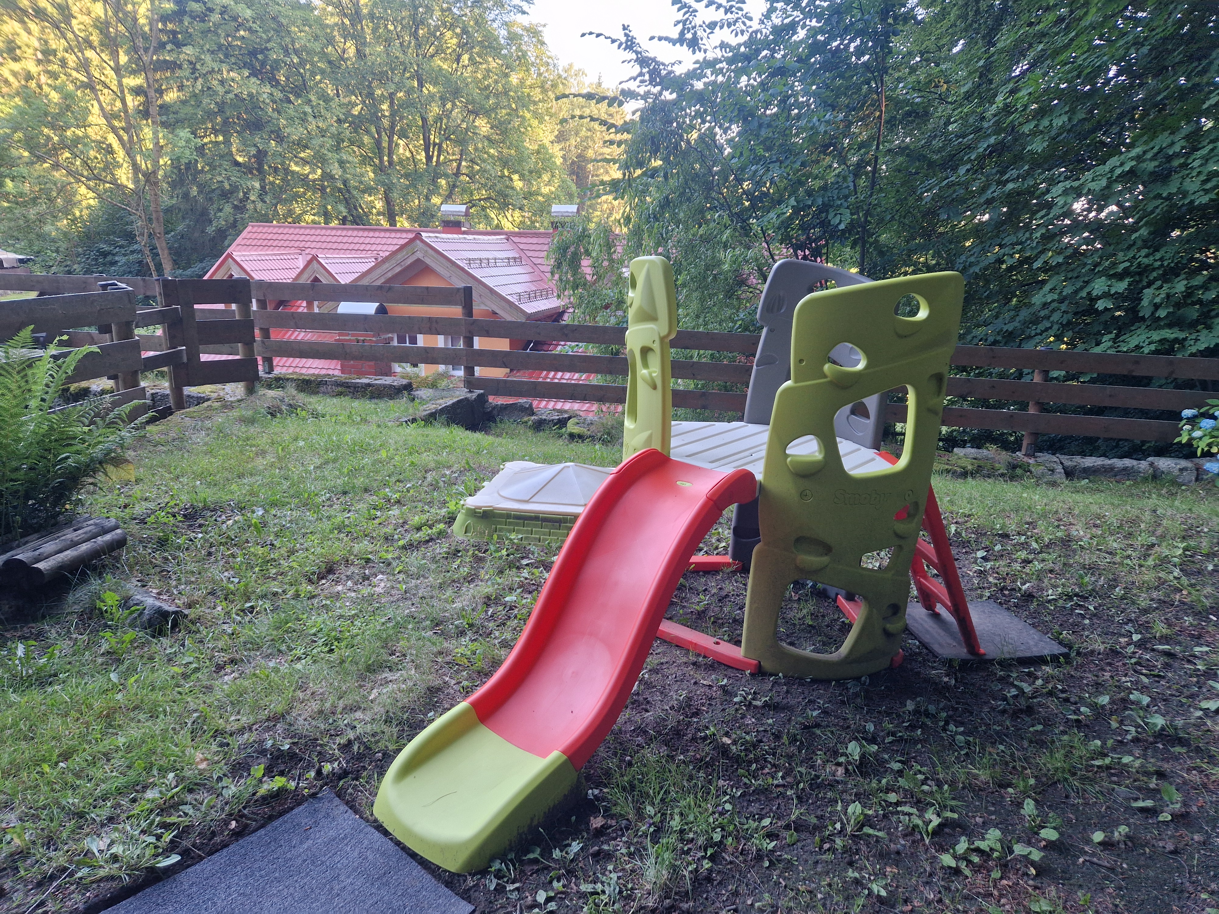 - zahrada s rybníkem, dětskou lezeckou věží, potokem a ohništěm